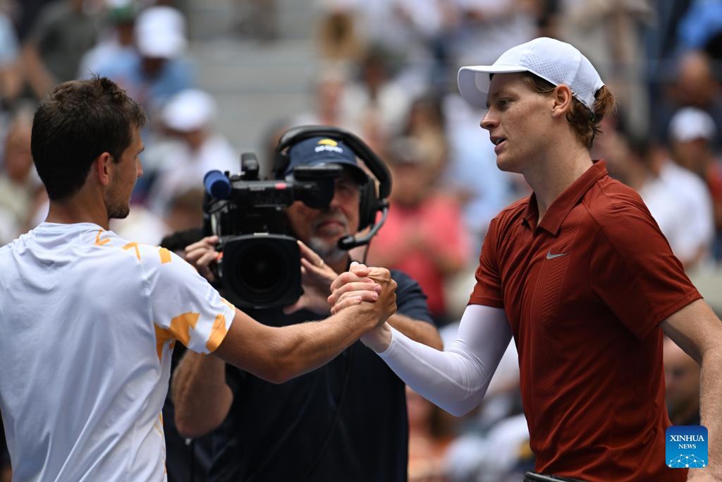 NUEVA YORK, 27 agosto, 2025 (Xinhua) -- Imagen del 26 de agosto de 2025 de Jannik Sinner (d), de Italia, estrechando la mano de Vit Kopriva, de República Checa, al término del partido de la primera ronda de individuales masculinos, en el campeonato de tenis US Open 2025, en Nueva York, Estados Unidos. (Xinhua/Li Rui)