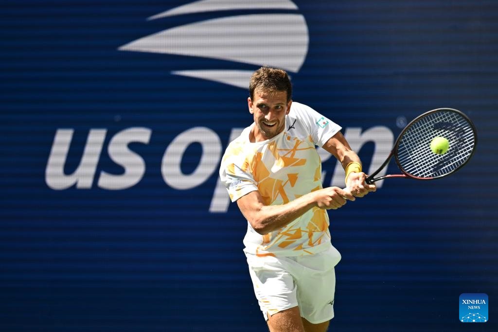 NUEVA YORK, 27 agosto, 2025 (Xinhua) -- Imagen del 26 de agosto de 2025 de Vit Kopriva, de República Checa, devolviendo la pelota durante el partido de la primera ronda de individuales masculinos ante Jannik Sinner, de Italia, en el campeonato de tenis US Open 2025, en Nueva York, Estados Unidos. (Xinhua/Li Rui)