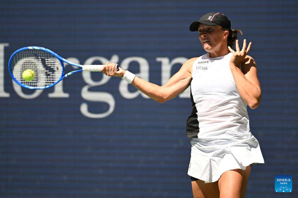 NUEVA YORK, 27 agosto, 2025 (Xinhua) -- Imagen del 26 de agosto de 2025 de Iga Swiatek, de Polonia, devolviendo la pelota durante el partido de la primera ronda de individuales femeninos ante Emiliana Arango, de Colombia, en el campeonato de tenis US Open 2025, en Nueva York, Estados Unidos. (Xinhua/Li Rui)