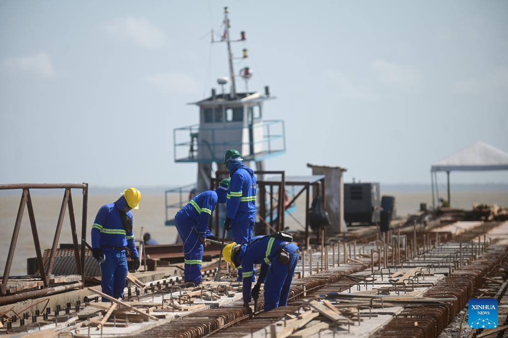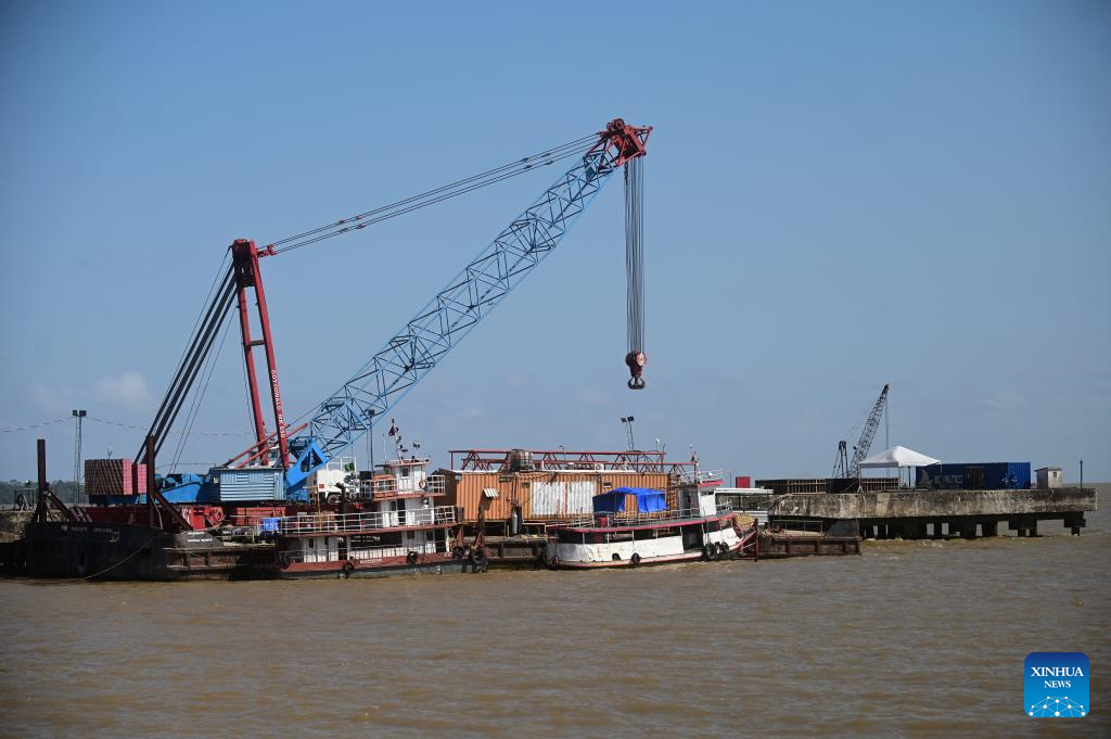 BELEM, 27 agosto, 2025 (Xinhua) -- Trabajadores laboran en el sitio de construcción de un nuevo puerto para el atraque de buques que servirán como hoteles durante la Conferencia de las Partes (COP30) de la Convención Marco de las Naciones Unidas sobre Cambio Climático, en Belém, estado de Pará, Brasil, el 27 de agosto de 2025. (Xinhua/Lucio Tavora)