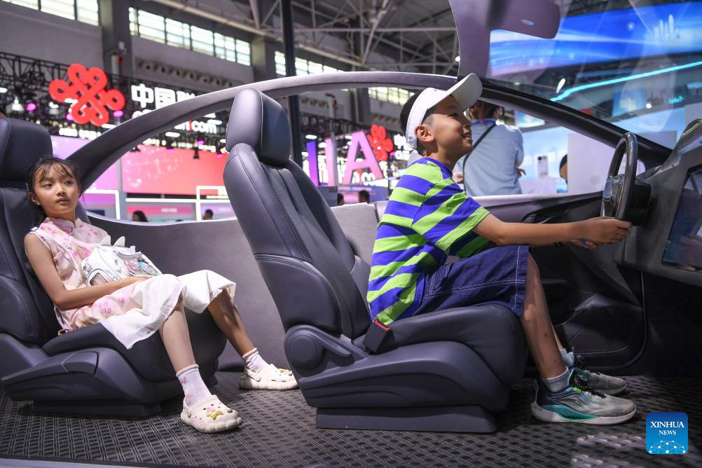 GUIYANG, 28 agosto, 2025 (Xinhua) -- Niños se sientan en una cabina de conducción inteligente con IA durante la Exposición Internacional de la Industria de Macrodatos de China 2025, en Guiyang, en la provincia de Guizhou, en el suroeste de China, el 28 de agosto de 2025. La exposición se inauguró aquí el jueves. (Xinhua/Yang Wenbin)