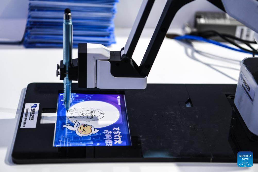 GUIYANG, 28 agosto, 2025 (Xinhua) -- Un robot inteligente con IA para dibujar retratos, exhibido por China Southern Power Grid, trabaja durante la Exposición Internacional de la Industria de Macrodatos de China 2025, en Guiyang, en la provincia de Guizhou, en el suroeste de China, el 28 de agosto de 2025. La exposición se inauguró aquí el jueves. (Xinhua/Yang Wenbin)