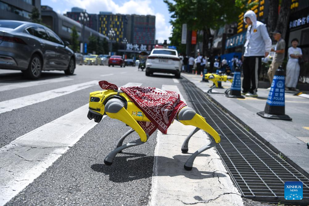 GUIYANG, 28 agosto, 2025 (Xinhua) -- Un perro robot cruza una calle cerca de la sede de la Exposición Internacional de la Industria de Macrodatos de China 2025, en Guiyang, en la provincia de Guizhou, en el suroeste de China, el 28 de agosto de 2025. La exposición se inauguró aquí el jueves. (Xinhua/Yang Wenbin)