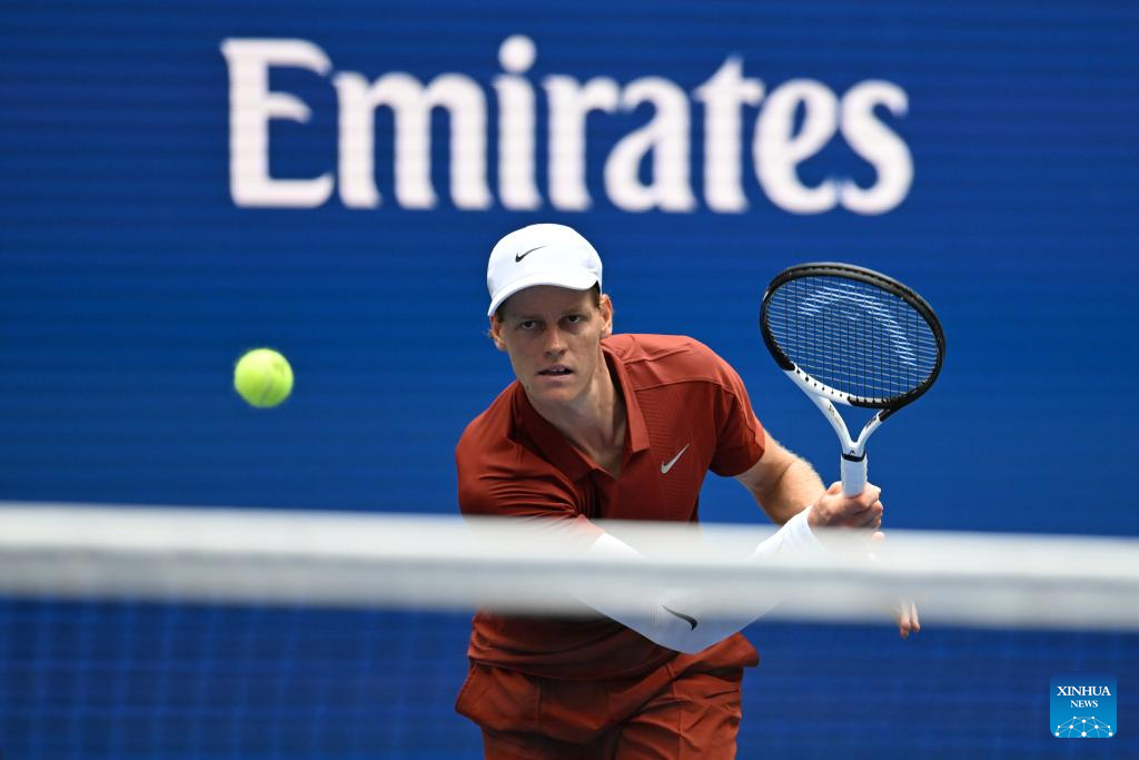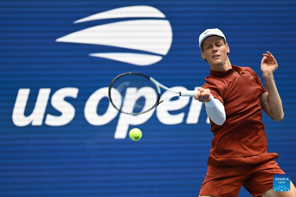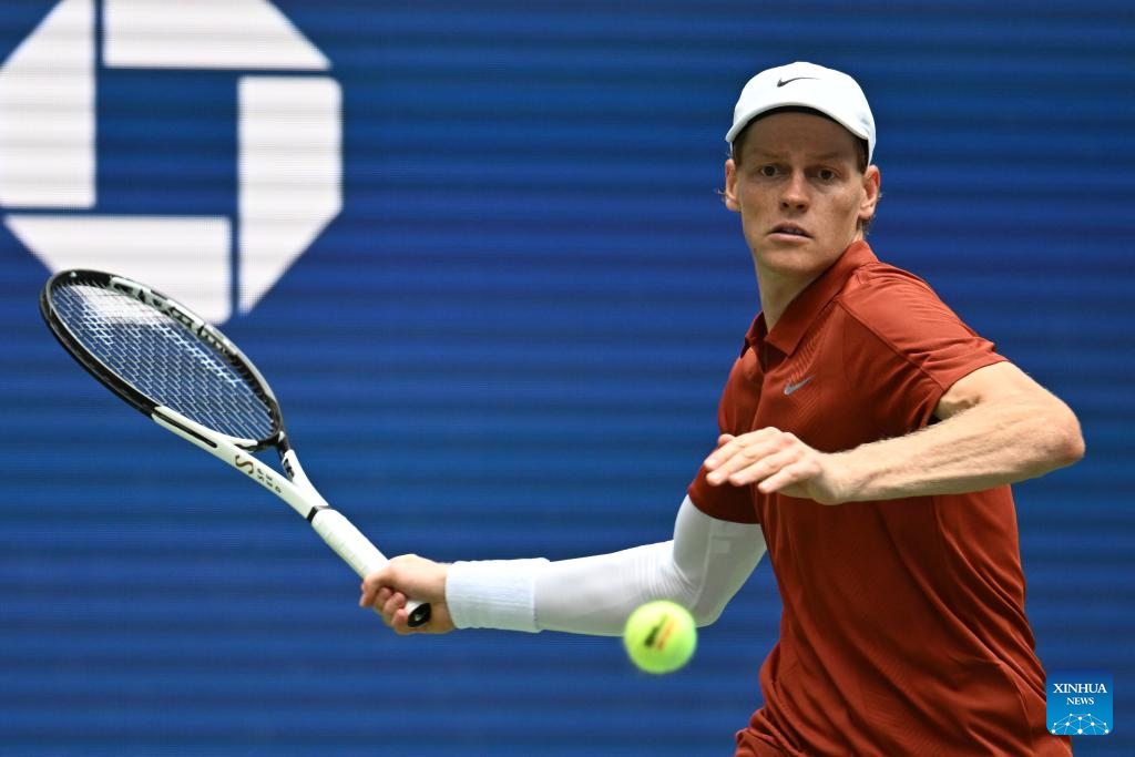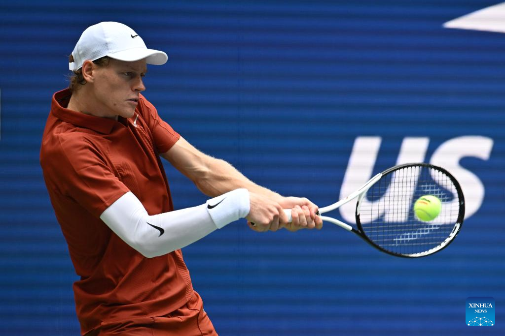 NUEVA YORK, 29 agosto, 2025 (Xinhua) -- Imagen del 28 de agosto de 2025 de Jannik Sinner devolviendo la pelota durante el partido de la segunda ronda de individuales masculinos entre Jannik Sinner, de Italia, y Alexei Popyrin, de Australia, en el campeonato de tenis US Open 2025, en Nueva York, Estados Unidos. (Xinhua/Li Rui)