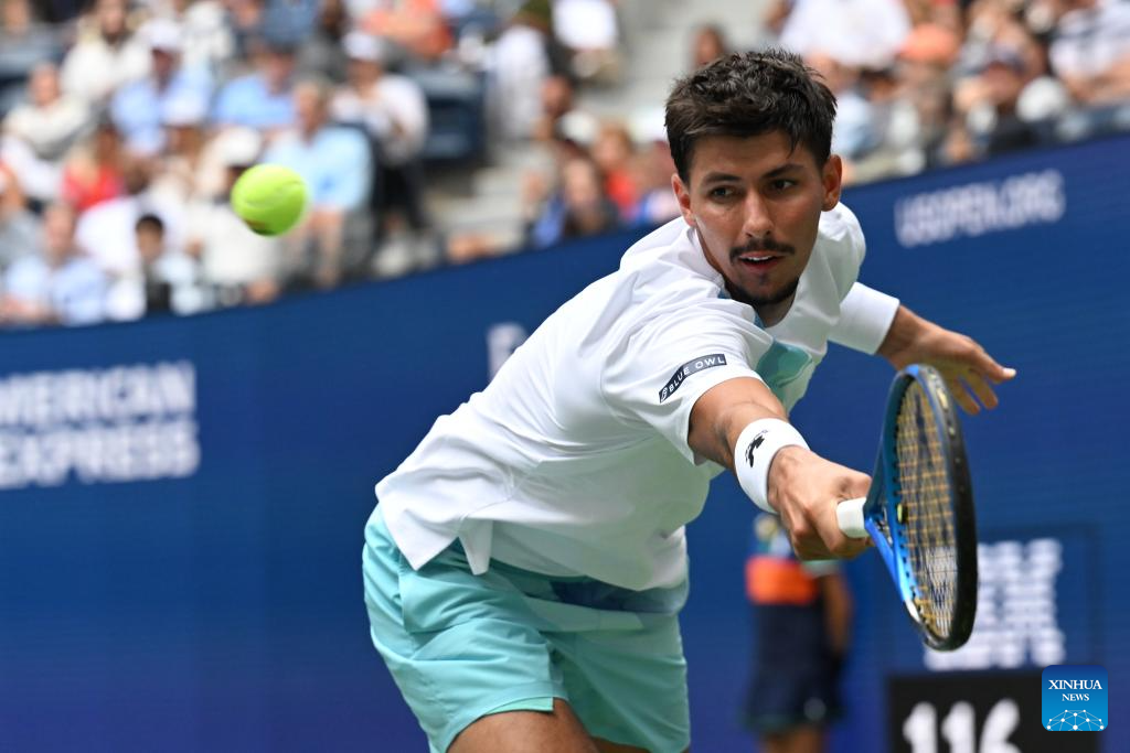 NUEVA YORK, 29 agosto, 2025 (Xinhua) -- Imagen del 28 de agosto de 2025 de Alexei Popyrin devolviendo la pelota durante el partido de la segunda ronda de individuales masculinos entre Jannik Sinner, de Italia, y Alexei Popyrin, de Australia, en el campeonato de tenis US Open 2025, en Nueva York, Estados Unidos. (Xinhua/Li Rui)
