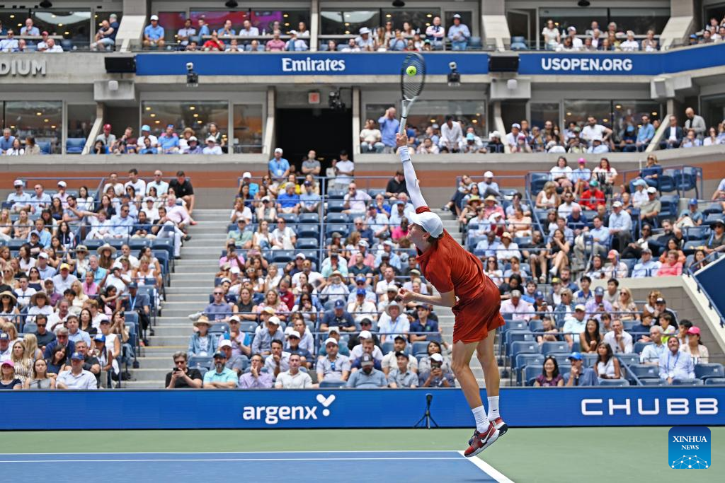 NUEVA YORK, 29 agosto, 2025 (Xinhua) -- Imagen del 28 de agosto de 2025 de Jannik Sinner sirviendo la pelota durante el partido de la segunda ronda de individuales masculinos entre Jannik Sinner, de Italia, y Alexei Popyrin, de Australia, en el campeonato de tenis US Open 2025, en Nueva York, Estados Unidos. (Xinhua/Li Rui)