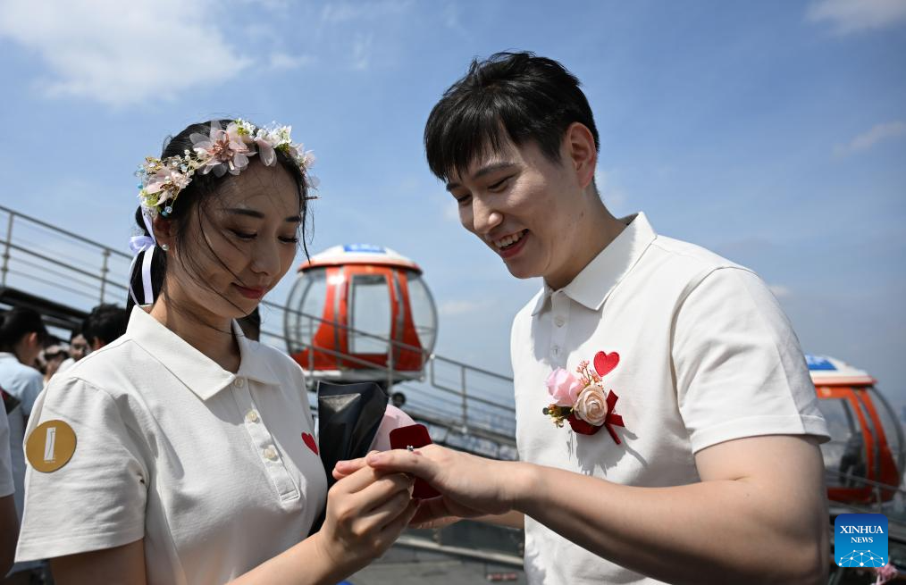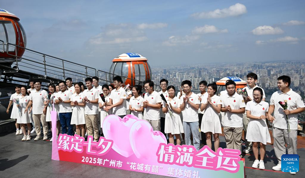 GUANGZHOU, 29 agosto, 2025 (Xinhua) -- Parejas participan en una boda colectiva llevada a cabo en la Torre de Cantón, en Guangzhou, en la provincia de Guangdong, en el sur de China, el 29 de agosto de 2025. Quince parejas participaron en una boda colectiva aquí en el Festival Qixi, también conocido como el Día de San Valentín chino, que este año cae en viernes. (Xinhua/Deng Hua)