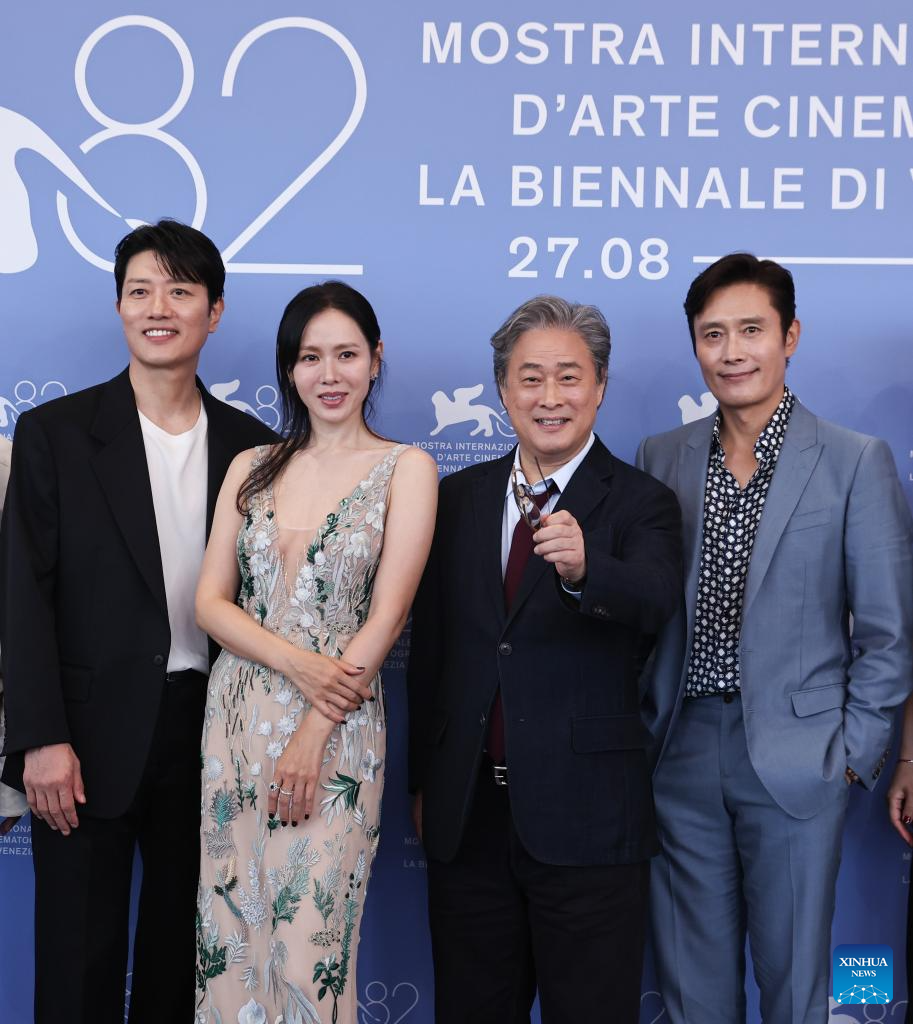 VENECIA, 29 agosto, 2025 (Xinhua) -- El reparto principal de la película "No Other Choice" posa para una sesión fotográfica durante el 82° Festival de Cine de Venecia, en Venecia, Italia, el 29 de agosto de 2025. (Xinhua/Li Jing)