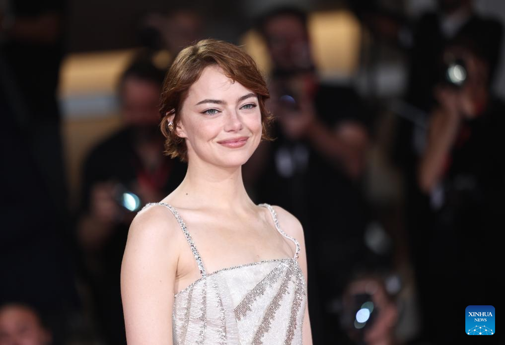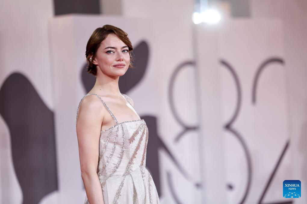VENECIA, 29 agosto, 2025 (Xinhua) -- Imagen del 28 de agosto de 2025 de Emma Stone posando para una fotografía en la alfombra roja previo al estreno de la película "Bugonia" durante el 82° Festival de Cine de Venecia, en Venecia, Italia. (Xinhua/Li Jing)