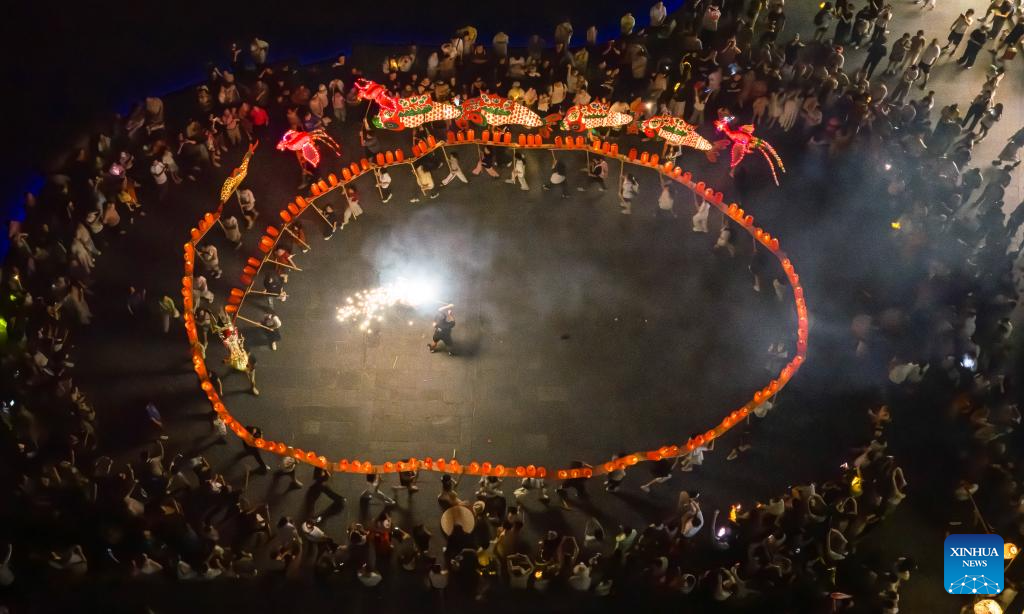 HEFEI, 29 agosto, 2025 (Xinhua) -- Vista aérea tomada con un dron el 27 de agosto de 2025 de un espectáculo de fuegos artificiales de hierro fundido y la presentación del Huohu (olla de fuego), en el distrito de Xiuning de la ciudad de Huangshan, en la provincia de Anhui, en el este de China. El mercado del turismo cultural de verano está en auge en la provincia de Anhui, donde el patrimonio cultural inmaterial se ha convertido en un importante atractivo para los visitantes. (Xinhua/Zhou Mu)