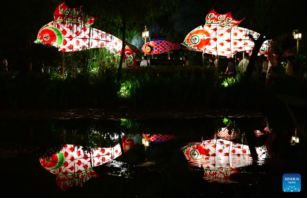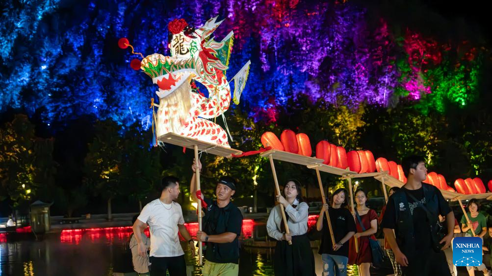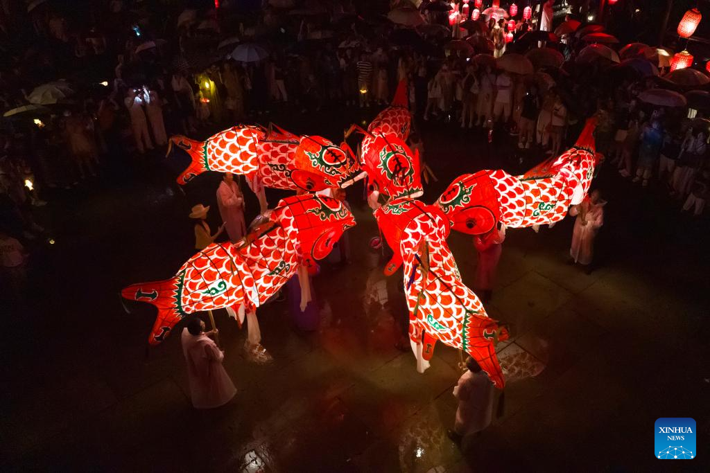 HEFEI, 29 agosto, 2025 (Xinhua) -- Imagen del 27 de agosto de 2025 de turistas observando un desfile de las linternas en forma de pez, en el distrito de Xiuning de la ciudad de Huangshan, en la provincia de Anhui, en el este de China. El mercado del turismo cultural de verano está en auge en la provincia de Anhui, donde el patrimonio cultural inmaterial se ha convertido en un importante atractivo para los visitantes. (Xinhua/Zhou Mu)