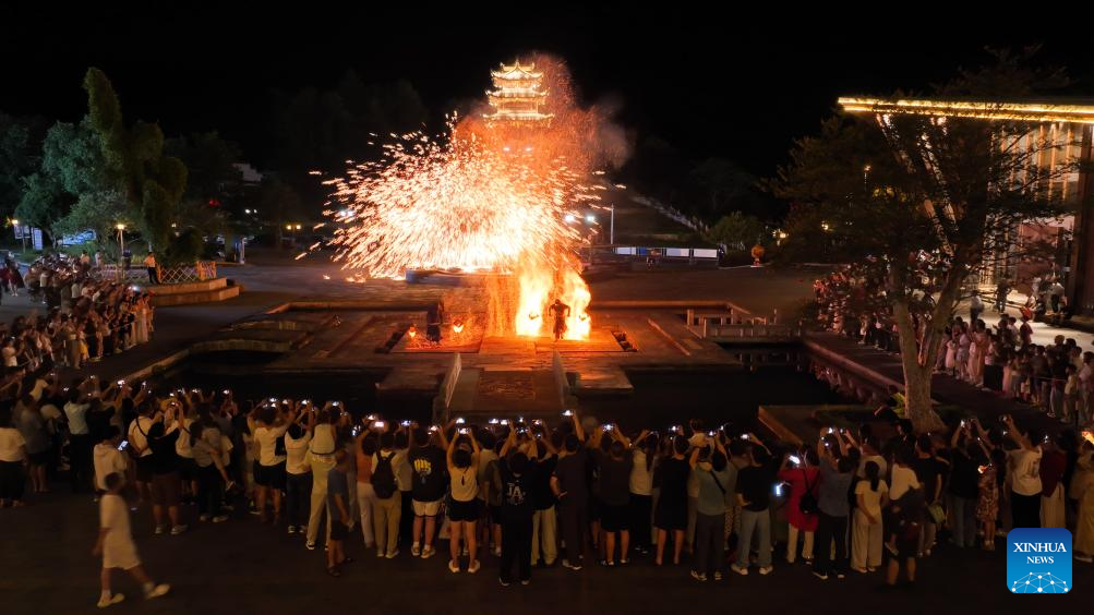 HEFEI, 29 agosto, 2025 (Xinhua) -- Imagen del 27 de agosto de 2025 de un espectáculo de fuegos artificiales de hierro fundido presentado en el distrito de Xiuning de la ciudad de Huangshan, en la provincia de Anhui, en el este de China. El mercado del turismo cultural de verano está en auge en la provincia de Anhui, donde el patrimonio cultural inmaterial se ha convertido en un importante atractivo para los visitantes. (Xinhua/Zhou Mu)