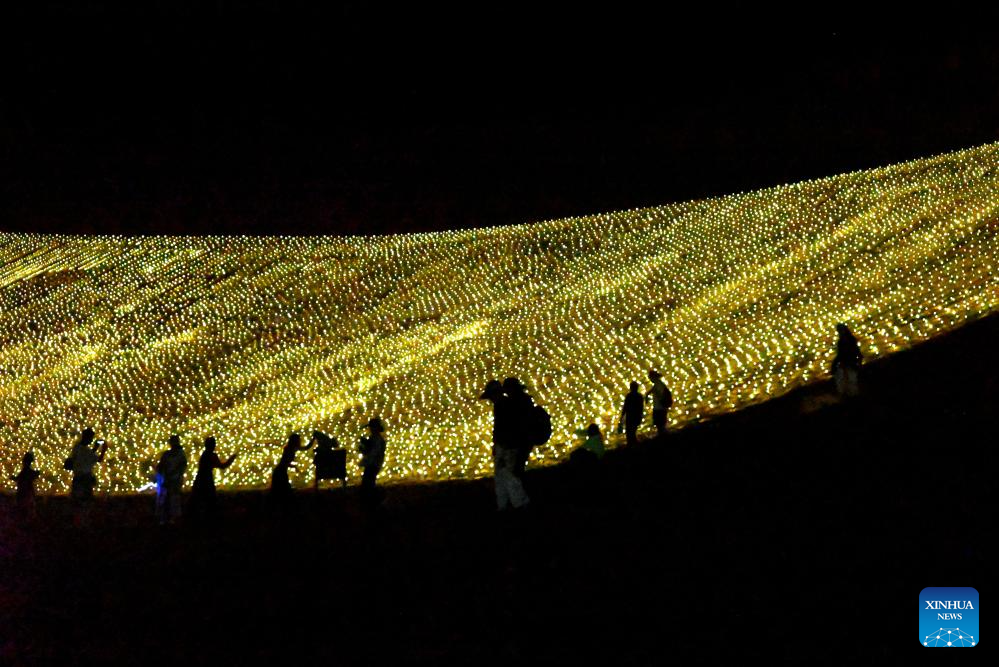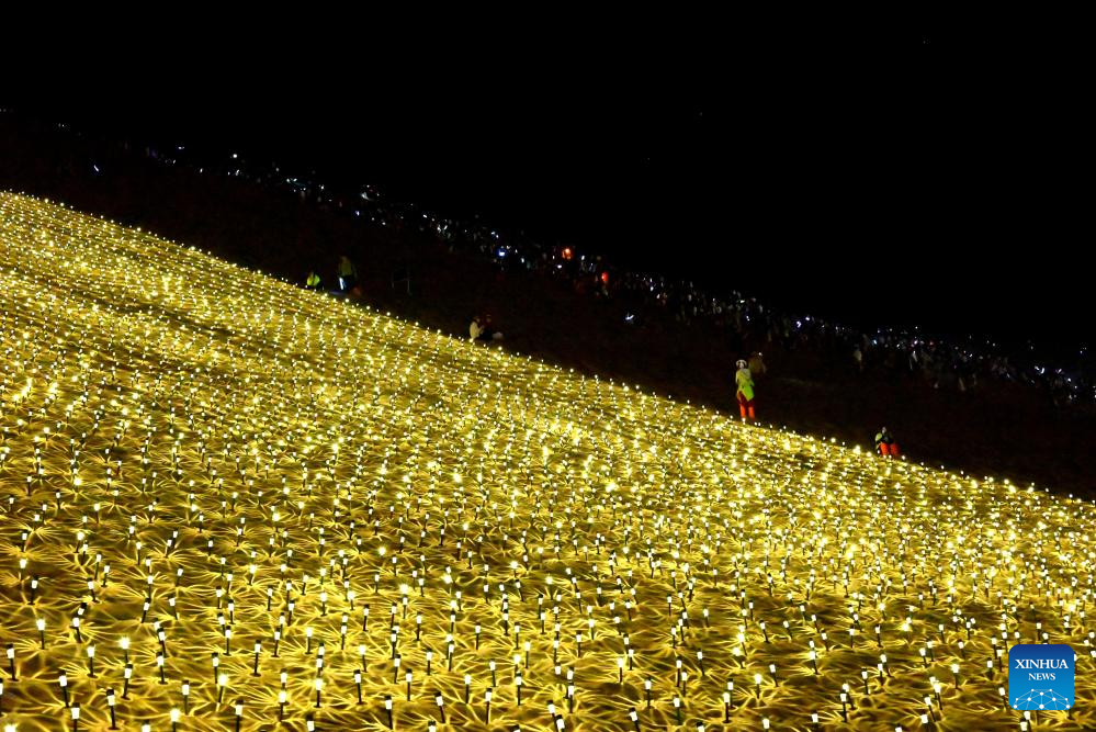 DUNHUANG, 29 agosto, 2025 (Xinhua) -- Imagen del 28 de agosto de 2025 de turistas visitando la Montaña Mingsha iluminada con luces alimentadas por energía solar, en la ciudad de Dunhuang, en la provincia de Gansu, en el noroeste de China. Un total de 40.000 luces alimentadas por energía solar instaladas en la Montaña Mingsha y el área escénica del Manantial de la Luna Creciente iluminaron un lado de la Montaña Mingsha el jueves, realzando el encanto del desierto en la noche. (Xinhua/Zhang Xiaoliang)