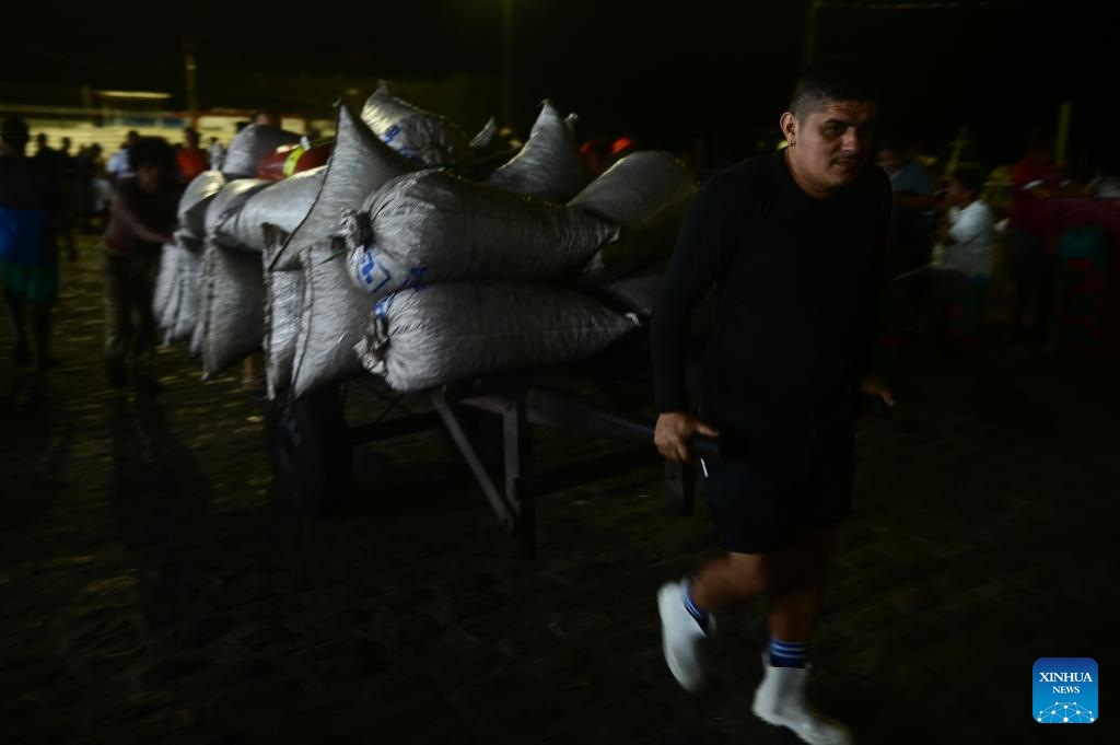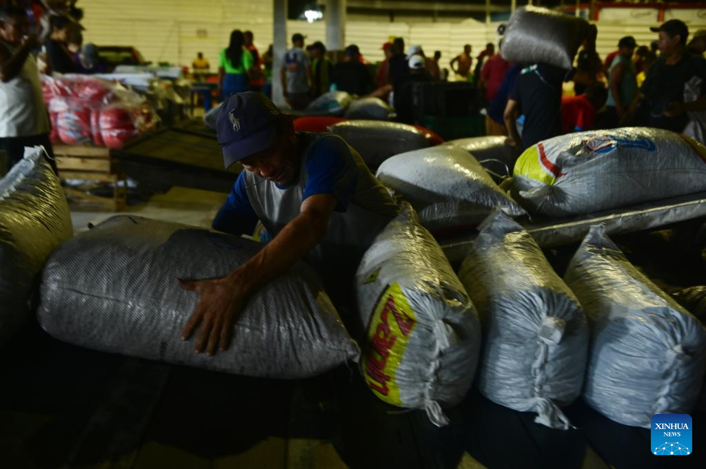 BELEM, 29 agosto, 2025 (Xinhua) -- Un hombre transporta costales de asaí en un mercado nocturno, en Belém, estado de Pará, Brasil, el 29 de agosto de 2025. (Xinhua/Lucio Tavora)
