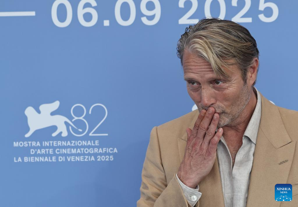 VENECIA, 30 agosto, 2025 (Xinhua) -- Mads Mikkelsen, de la película "The Last Viking", posa para la sesión fotográfica durante el 82° Festival de Cine de Venecia, en Venecia, Italia, el 30 de agosto de 2025. (Xinhua/Li Jing)
