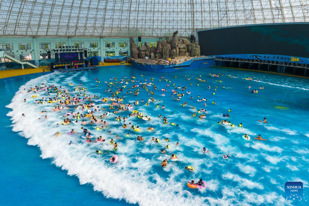 HEFEI, 30 agosto, 2025 (Xinhua) -- Imagen tomada con un dron el 3 de agosto de 2025 de personas jugando en una instalación de deportes acuáticos, en el distrito de Nanling, en la ciudad de Wuhu, en la provincia de Anhui, en el este de China. Durante las vacaciones de verano, las ciudades de la provincia de Anhui han aprovechado sus abundantes recursos montañosos e hídricos para desarrollar una "economía de refrescamiento", atrayendo a un gran número de visitantes. (Xinhua/Xiao Benxiang)