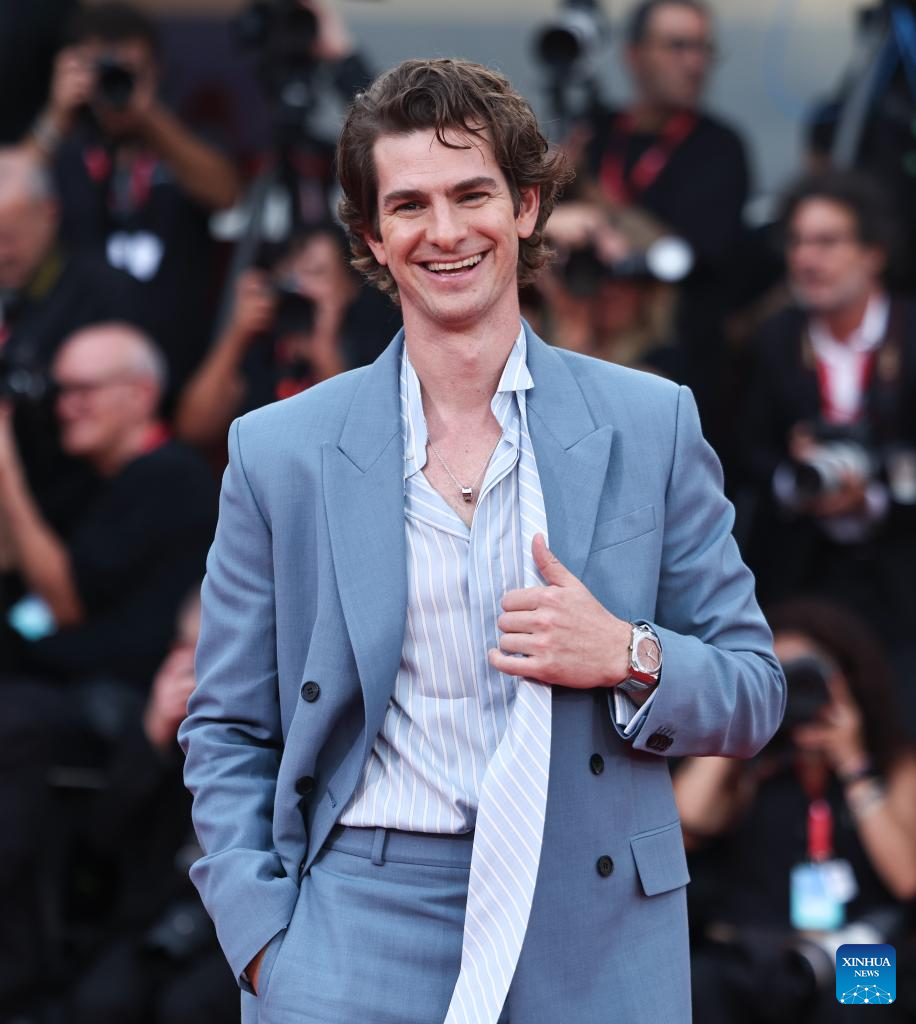 VENECIA, 30 agosto, 2025 (Xinhua) -- Imagen del 29 de agosto de 2025 del actor Andrew Garfield de la película "After the Hunt" llegando a la alfombra roja del estreno durante el 82° Festival de Cine de Venecia, en Venecia, Italia. (Xinhua/Li Jing)