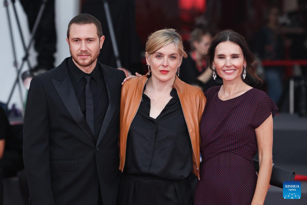 VENECIA, 30 agosto, 2025 (Xinhua) -- Imagen del 29 de agosto de 2025 de los actores Bastien Bouillon (i), Virginie Ledoyen (d) y la directora Valerie Donzelli (c) de la película "A Pied d'Oeuvre" posando para una fotografía en la alfombra roja del estreno durante el 82° Festival de Cine de Venecia, en Venecia, Italia. (Xinhua/Li Jing)