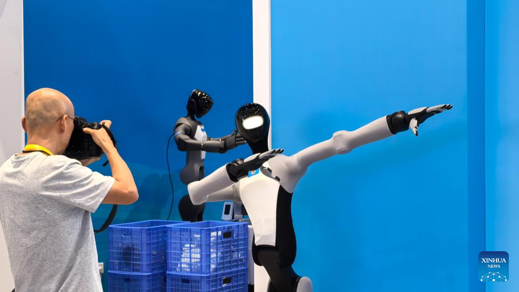 TIANJIN, 31 agosto, 2025 (Xinhua) -- Imagen del 30 de agosto de 2025 de un fotógrafo siendo atraído por un robo demostrando la destreza de sus brazos en el centro de medios de la Cumbre 2025 de la Organización de Cooperación de Shanghai (OCS), en Tianjin, en el norte de China. Una variedad de robots han atraído numerosos ojos en el centro de medios mientras la Cumbre 2025 de la OCS se lleva a cabo en la ciudad portuaria del 31 de agosto al 1 de septiembre. (Xinhua/Wang Jianhua)
