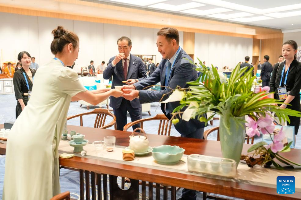 TIANJIN, 31 agosto, 2025 (Xinhua) -- Invitados experimentan la cultura del té chino previo a un banquete de bienvenida en el Centro de Convenciones y Exposiciones de Meijiang, en Tianjin, en el norte de China, el 31 de agosto de 2025. El presidente chino, Xi Jinping y su esposa, Peng Liyuan, ofrecieron el domingo un banquete en la ciudad portuaria china de Tianjin para dar la bienvenida a los invitados internacionales que se encuentran en el país para asistir a la Cumbre 2025 de la Organización de Cooperación de Shanghai (OCS). Antes del banquete, los invitados observaron y experimentaron el patrimonio cultural inmaterial de China y mantuvieron intercambios amistosos en una atmósfera armoniosa. (Xinhua/Bi Xiaoyang)