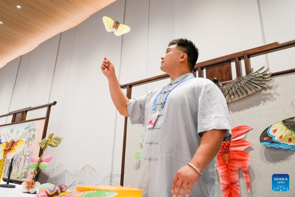 TIANJIN, 31 agosto, 2025 (Xinhua) -- Un empleado muestra sus habilidades para elaborar cometas previo a un banquete de bienvenida en el Centro de Convenciones y Exposiciones de Meijiang, en Tianjin, en el norte de China, el 31 de agosto de 2025. El presidente chino, Xi Jinping y su esposa, Peng Liyuan, ofrecieron el domingo un banquete en la ciudad portuaria china de Tianjin para dar la bienvenida a los invitados internacionales que se encuentran en el país para asistir a la Cumbre 2025 de la Organización de Cooperación de Shanghai (OCS). Antes del banquete, los invitados observaron y experimentaron el patrimonio cultural inmaterial de China y mantuvieron intercambios amistosos en una atmósfera armoniosa. (Xinhua/Bi Xiaoyang)
