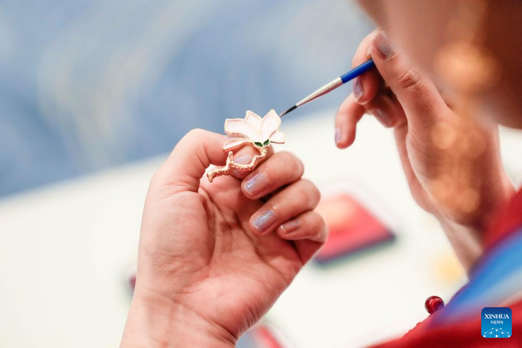 TIANJIN, 31 agosto, 2025 (Xinhua) -- Una empleada muestra una artesanía de mosaico de filigrana previo a un banquete de bienvenida en el Centro de Convenciones y Exposiciones de Meijiang, en Tianjin, en el norte de China, el 31 de agosto de 2025. El presidente chino, Xi Jinping y su esposa, Peng Liyuan, ofrecieron el domingo un banquete en la ciudad portuaria china de Tianjin para dar la bienvenida a los invitados internacionales que se encuentran en el país para asistir a la Cumbre 2025 de la Organización de Cooperación de Shanghai (OCS). Antes del banquete, los invitados observaron y experimentaron el patrimonio cultural inmaterial de China y mantuvieron intercambios amistosos en una atmósfera armoniosa. (Xinhua/Bi Xiaoyang)