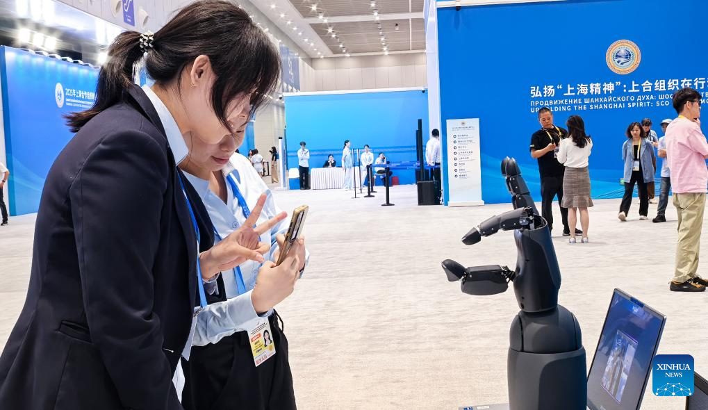 TIANJIN, 31 agosto, 2025 (Xinhua) -- Imagen del 30 de agosto de 2025 de personas interactuando con una mano robótica capaz de demostrar gran destreza y un fino sentido táctil en el centro de medios de la Cumbre 2025 de la Organización de Cooperación de Shanghai (OCS), en Tianjin, en el norte de China. Una variedad de robots han atraído numerosos ojos en el centro de medios mientras la Cumbre 2025 de la OCS se lleva a cabo en la ciudad portuaria del 31 de agosto al 1 de septiembre. (Xinhua/Wang Jianhua)