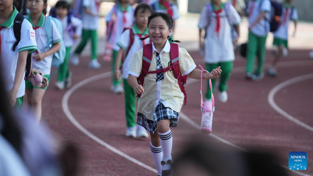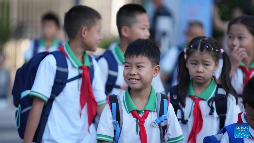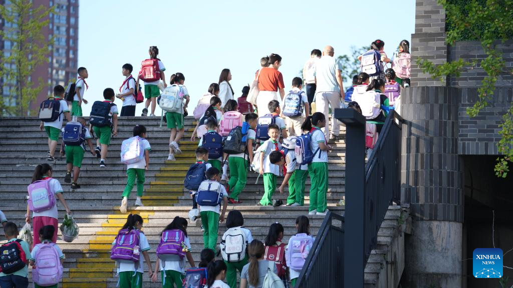 GUIYANG, 1 septiembre, 2025 (Xinhua) -- Estudiantes llegan a una escuela primaria, en Guiyang, en la provincia de Guizhou, en el suroeste de China, el 1 de septiembre de 2025. El nuevo semestre para las escuelas primarias y secundarias comenzó el lunes en muchas partes de China. (Xinhua/Tao Liang)