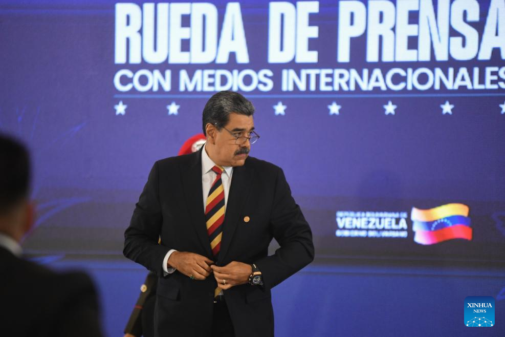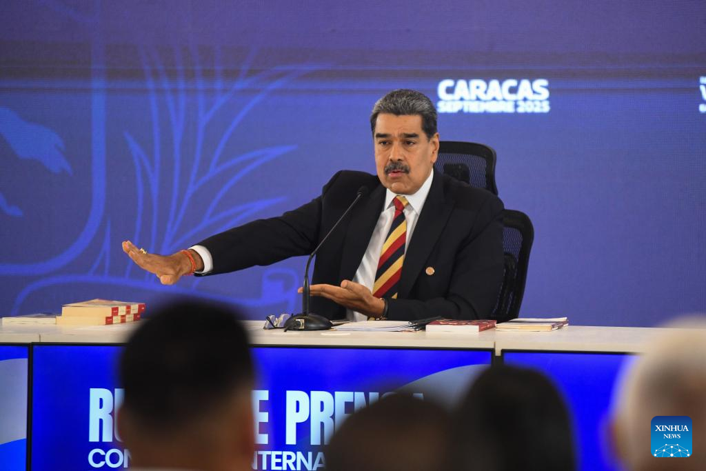 CARACAS, 1 septiembre, 2025 (Xinhua) -- El presidente venezolano, Nicolás Maduro, habla durante una conferencia de prensa internacional, en Caracas, Venezuela, el 1 de septiembre de 2025. Venezuela enfrenta "la más grande amenaza" que se haya visto en el continente en los últimos 100 años, afirmó el lunes Maduro, al señalar que ocho barcos militares con 1.200 misiles y un submarino nuclear "apuntan" al país sudamericano. (Xinhua/Marcos Salgado)