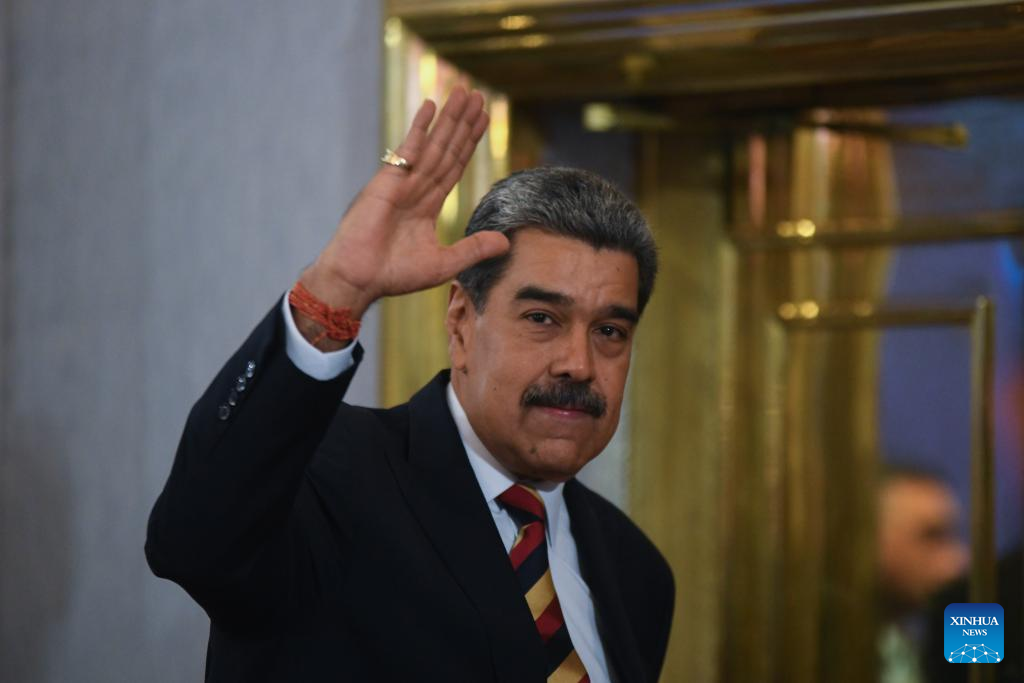 CARACAS, 1 septiembre, 2025 (Xinhua) -- El presidente venezolano, Nicolás Maduro, saluda después de una conferencia de prensa internacional, en Caracas, Venezuela, el 1 de septiembre de 2025. Venezuela enfrenta "la más grande amenaza" que se haya visto en el continente en los últimos 100 años, afirmó el lunes Maduro, al señalar que ocho barcos militares con 1.200 misiles y un submarino nuclear "apuntan" al país sudamericano. (Xinhua/Marcos Salgado)