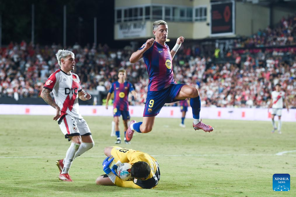 MADRID, 1 septiembre, 2025 (Xinhua) -- Imagen del 31 de agosto de 2025 de Robert Lewandowski (arriba), de FC Barcelona, disputando el balón con el guardameta Augusto Batalla (abajo), de Rayo Vallecano, durante el partido de fútbol de LaLiga, entre FC Barcelona y Rayo Vallecano, en el Estadio Vallecas, en Madrid, España. (Xinhua/Gustavo Valiente)
