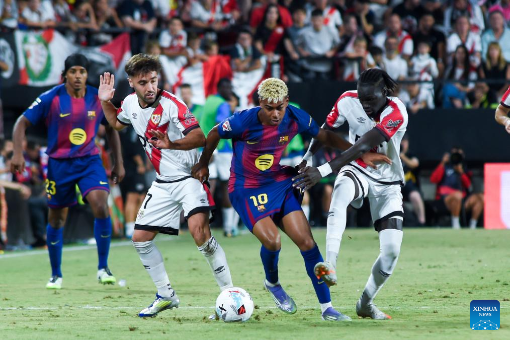 MADRID, 1 septiembre, 2025 (Xinhua) -- Imagen del 31 de agosto de 2025 de Lamine Yamal (2-d), de FC Barcelona, disputando el balón con Unai López (2-i), y Pathe Ciss (d), de Rayo Vallecano, durante el partido de fútbol de LaLiga, entre FC Barcelona y Rayo Vallecano, en el Estadio Vallecas, en Madrid, España. (Xinhua/Gustavo Valiente)