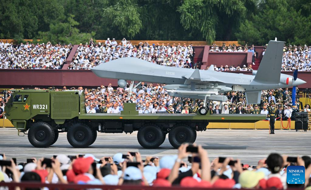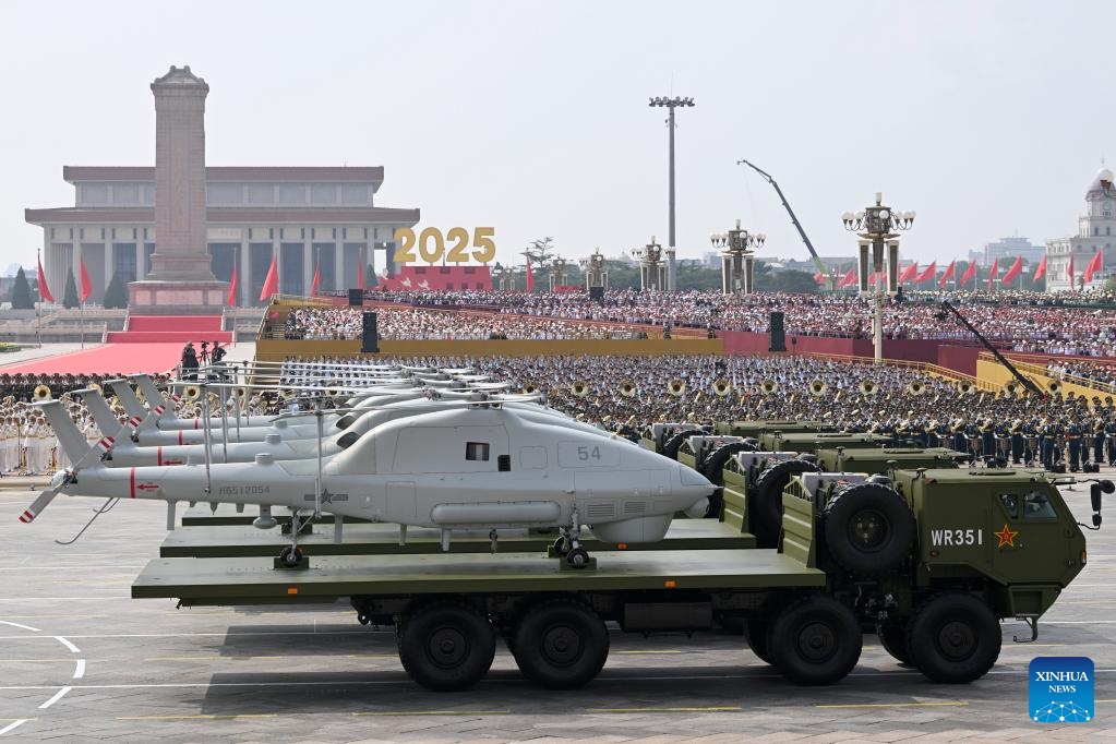 BEIJING, 3 sep (Xinhua) -- Drones de reconocimiento y ataque, drones de apoyo aéreo y helicópteros no tripulados basados en buques pasaron por la Plaza Tian'anmen durante el desfile militar celebrado hoy miércoles para conmemorar el Día de la Victoria de China.