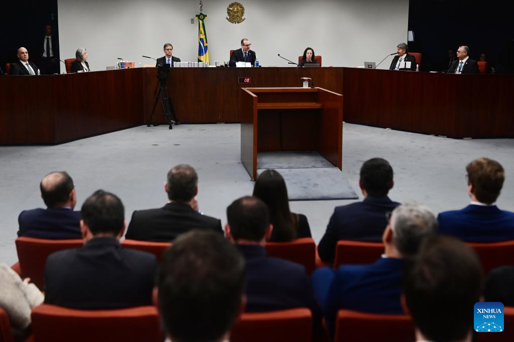 BRASILIA, 2 septiembre, 2025 (Xinhua) -- Imagen del 2 de septiembre de 2025 del juicio al expresidente brasileño Jair Bolsonaro (2019-2022) y a otros siete acusados de participar en la tentativa de golpe de Estado para revertir el resultado de las elecciones de 2022, en Brasilia, Brasil. El presidente de la Primera Sala del Supremo Tribunal Federal de Brasil, Cristiano Zanin, abrió el martes en la ciudad de Brasilia el juicio al expresidente Jair Bolsonaro y a otros siete acusados de participar en la tentativa de golpe de Estado para revertir el resultado de las elecciones de 2022. (Xinhua/Lucio Tavora)