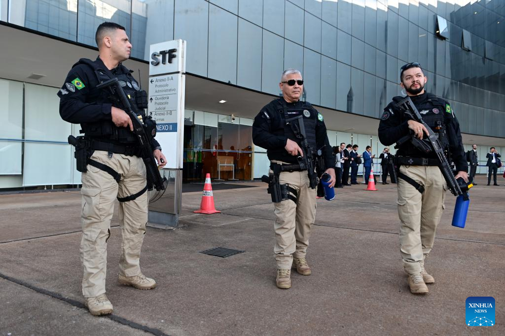 BRASILIA, 2 septiembre, 2025 (Xinhua) -- Policías vigilan frente al Tribunal Supremo Federal (STF) durante el juicio del expresidente Jair Bolsonaro (2019-2022)y a otros siete acusados de participar en la tentativa de golpe de Estado para revertir el resultado de las elecciones de 2022, en Brasilia, Brasil, el 2 de septiembre de 2025. El presidente de la Primera Sala del STF de Brasil, Cristiano Zanin, abrió el martes en la ciudad de Brasilia el juicio al expresidente Jair Bolsonaro y a otros siete acusados de participar en la tentativa de golpe de Estado para revertir el resultado de las elecciones de 2022. (Xinhua/Lucio Tavora)