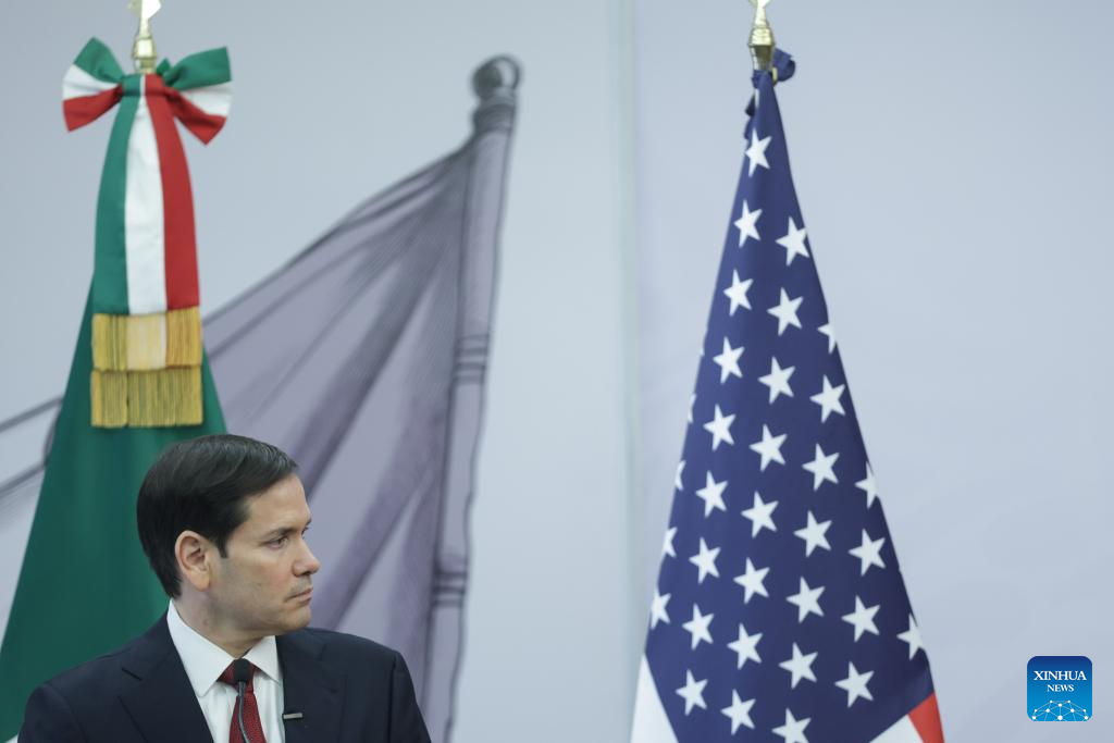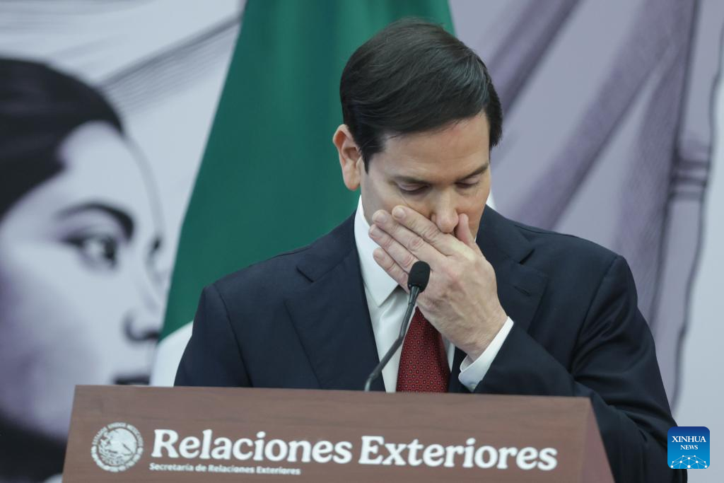 CIUDAD DE MEXICO, 3 septiembre, 2025 (Xinhua) -- El secretario de Estado estadounidense, Marco Rubio, reacciona durante una conferencia de prensa conjunta con el canciller mexicano, Juan Ramón de la Fuente, en la Ciudad de México, capital de México, el 3 de septiembre de 2025. México y Estados Unidos reafirmaron el miércoles su compromiso de fortalecer la cooperación en materia de seguridad, bajo los principios de reciprocidad, respeto a la soberanía, integridad territorial, responsabilidad compartida y confianza mutua, informaron ambos gobiernos en un comunicado conjunto. (Xinhua/Francisco Cañedo)