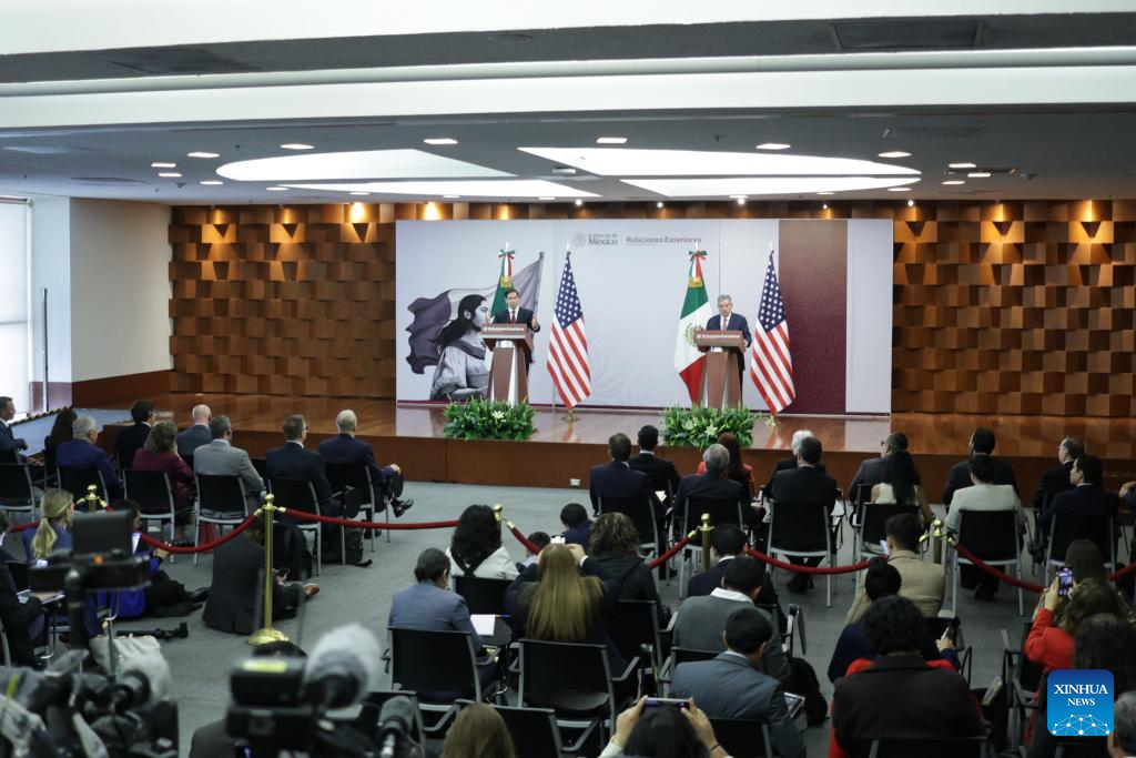 CIUDAD DE MEXICO, 3 septiembre, 2025 (Xinhua) -- El canciller mexicano, Juan Ramón de la Fuente (d-atrás), y el secretario de Estado estadounidense, Marco Rubio (i-atrás), participan en una conferencia de prensa conjunta, en la Ciudad de México, capital de México, el 3 de septiembre de 2025. México y Estados Unidos reafirmaron el miércoles su compromiso de fortalecer la cooperación en materia de seguridad, bajo los principios de reciprocidad, respeto a la soberanía, integridad territorial, responsabilidad compartida y confianza mutua, informaron ambos gobiernos en un comunicado conjunto. (Xinhua/Francisco Cañedo)