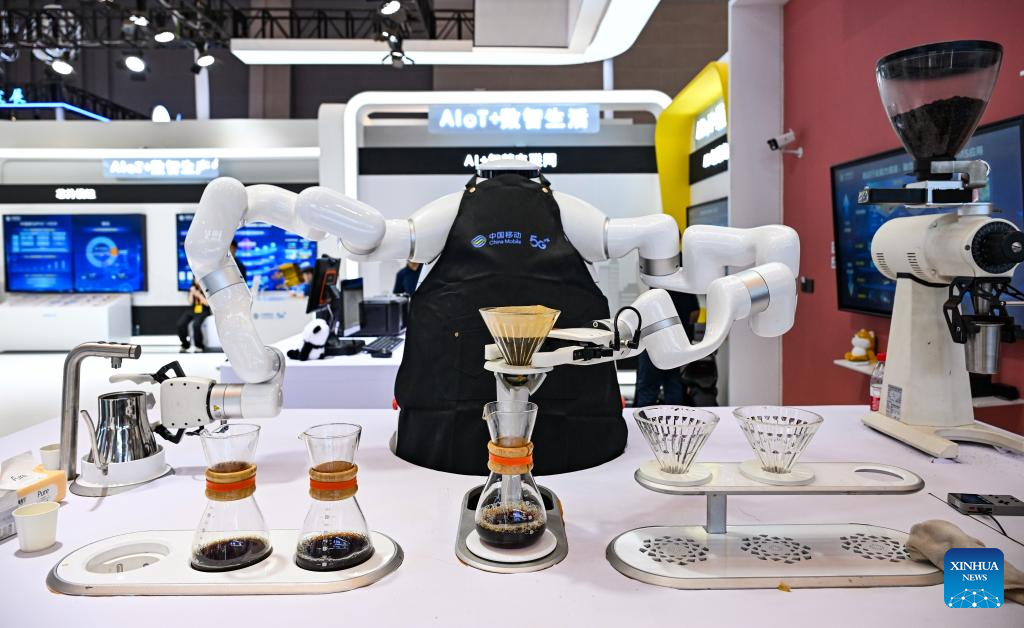 CHONGQING, 5 septiembre, 2025 (Xinhua) -- Un robot prepara café durante la Exposición Mundial de la Industria Inteligente 2025, en Chongqing, en el suroeste de China, el 5 de septiembre de 2025. La Exposición Mundial de la Industria Inteligente 2025 comenzó el viernes en la municipalidad de Chongqing, reuniendo a más de 600 empresas nacionales e internacionales para mostrar innovaciones en varios sectores, incluida la conducción autónoma, los hogares inteligentes y la economía de baja altitud. (Xinhua/Wang Quanchao)