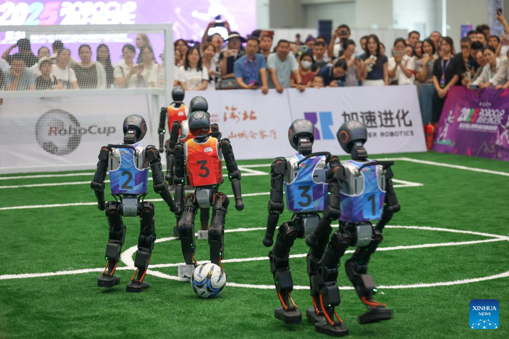 CHONGQING, 5 septiembre, 2025 (Xinhua) -- Robots compiten durante un partido de fútbol robótico 3 vs 3 en la Exposición Mundial de la Industria Inteligente 2025, en Chongqing, en el suroeste de China, el 5 de septiembre de 2025. La Exposición Mundial de la Industria Inteligente 2025 comenzó el viernes en la municipalidad de Chongqing, reuniendo a más de 600 empresas nacionales e internacionales para mostrar innovaciones en varios sectores, incluida la conducción autónoma, los hogares inteligentes y la economía de baja altitud. (Xinhua/Chen Cheng)