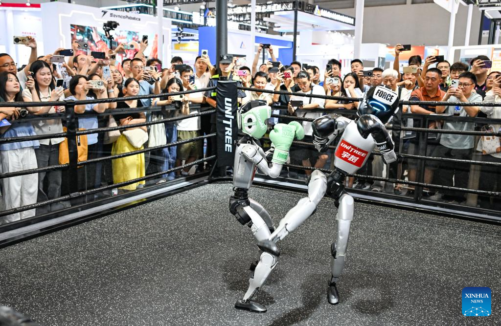 CHONGQING, 5 septiembre, 2025 (Xinhua) -- Robots compiten durante un juego de boxeo en la Exposición Mundial de la Industria Inteligente 2025, en Chongqing, en el suroeste de China, el 5 de septiembre de 2025. La Exposición Mundial de la Industria Inteligente 2025 comenzó el viernes en la municipalidad de Chongqing, reuniendo a más de 600 empresas nacionales e internacionales para mostrar innovaciones en varios sectores, incluida la conducción autónoma, los hogares inteligentes y la economía de baja altitud. (Xinhua/Wang Quanchao)