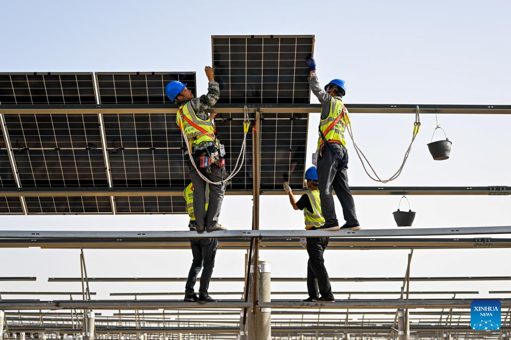 ERDOS, 4 septiembre, 2025 (Xinhua) -- Trabajadores instalan paneles fotovoltaicos en una nueva base energética, en el desierto de Kubuqi, en la región autónoma de Mongolia Interior, en el norte de China, el 2 de septiembre de 2025. En los últimos años, Mongolia Interior ha llevado a cabo proyectos integrados para la prevención y control de la arena, así como para la energía eólica y fotovoltaica, para impulsar los esfuerzos de mejoras en el desierto de Kubuqi. (Xinhua/Li Zhipeng)