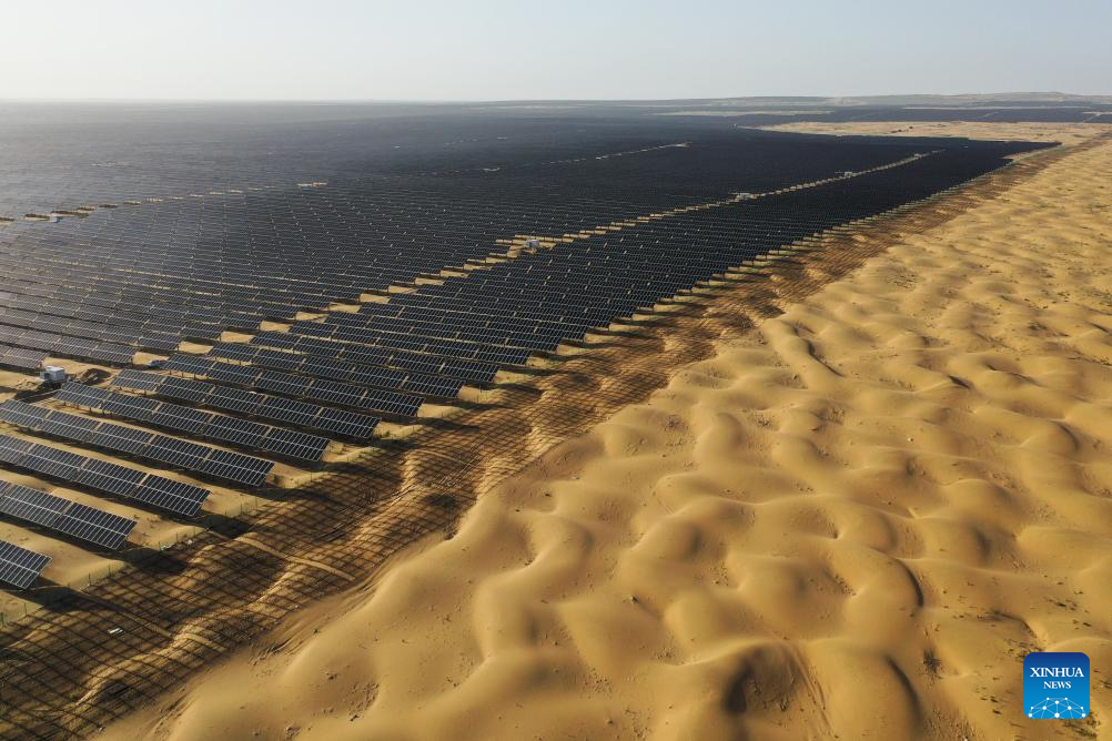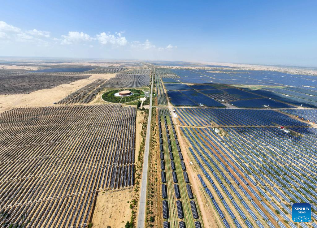 ERDOS, 4 septiembre, 2025 (Xinhua) -- Vista aérea tomada con un dron el 2 de septiembre de 2025 de una nueva base energética, en el desierto de Kubuqi, en la región autónoma de Mongolia Interior, en el norte de China. En los últimos años, Mongolia Interior ha llevado a cabo proyectos integrados para la prevención y control de la arena, así como para la energía eólica y fotovoltaica, para impulsar los esfuerzos de mejoras en el desierto de Kubuqi. (Xinhua/Li Zhipeng)