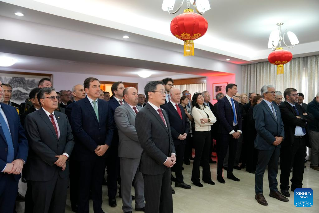 Imagen del 4 de septiembre de 2025 del embajador chino en Uruguay, Huang Yazhong (frente), participando durante el acto conmemorativo del 80º aniversario de la Victoria en la Guerra de Resistencia del Pueblo Chino contra la Agresión Japonesa y de la Guerra Mundial Antifascista, en la residencia del embajador, en Montevideo, capital de Uruguay. Autoridades del Gobierno de Uruguay, sectores políticos y organizaciones sociales participaron el jueves del acto conmemorativo del 80º aniversario de la Victoria en la Guerra de Resistencia del Pueblo Chino contra la Agresión Japonesa y de la Guerra Mundial Antifascista organizada por la Embajada de China en Montevideo. (Xinhua/Nicolás Celaya)