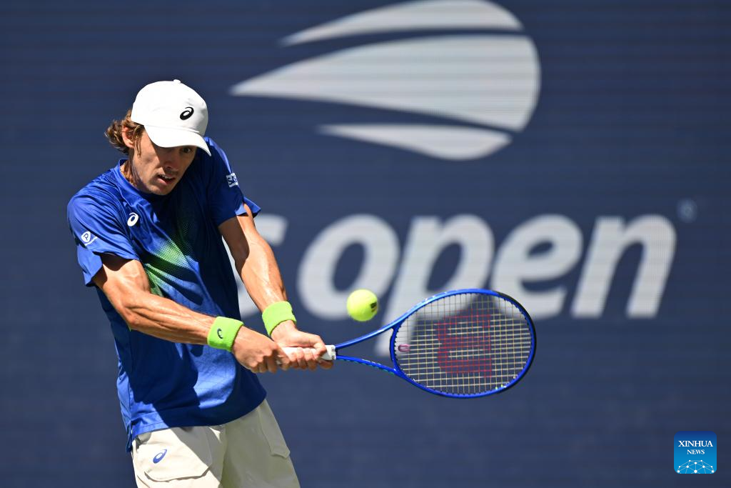 NUEVA YORK, 4 septiembre, 2025 (Xinhua) -- Imagen del 3 de septiembre de 2025 de Alex De Minaur, de Australia, devolviendo la pelota durante el partido de cuartos de final de individuales masculinos ante Felix Auger-Aliassime, de Canadá, en el campeonato de tenis US Open 2025, en Nueva York, Estados Unidos. (Xinhua/Li Rui)
