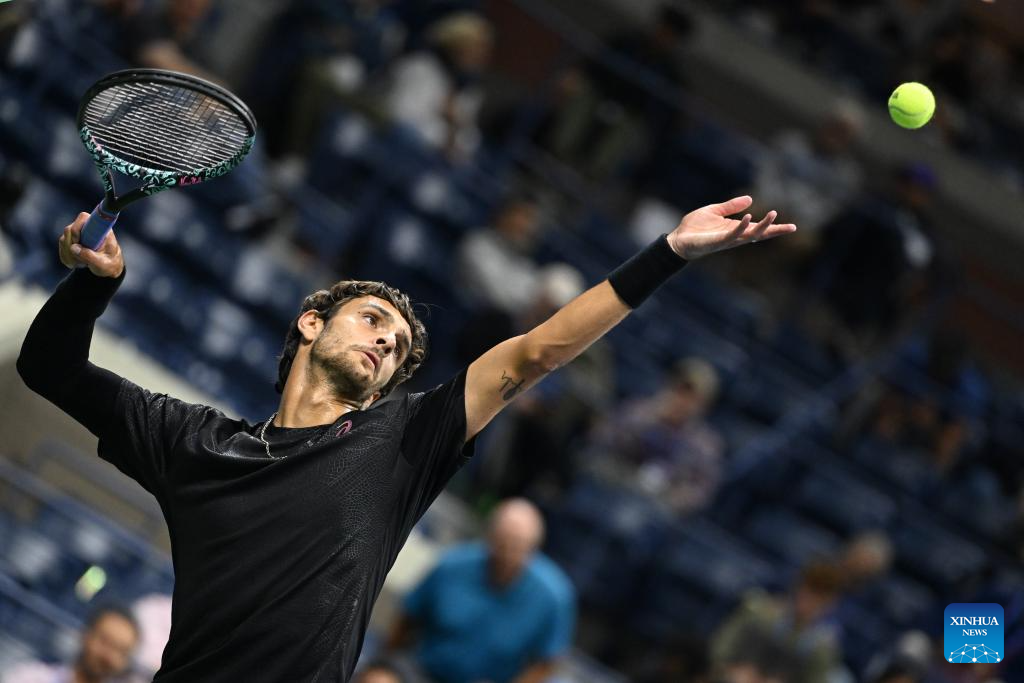 NUEVA YORK, 4 septiembre, 2025 (Xinhua) -- Imagen del 3 de septiembre de 2025 de Lorenzo Musetti sirviendo la pelota durante el partido de cuartos de final de individuales masculinos entre Jannik Sinner, de Italia, y Lorenzo Musetti, de Italia, en el campeonato de tenis US Open 2025, en Nueva York, Estados Unidos. (Xinhua/Li Rui)