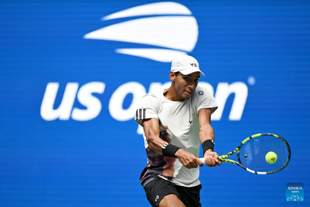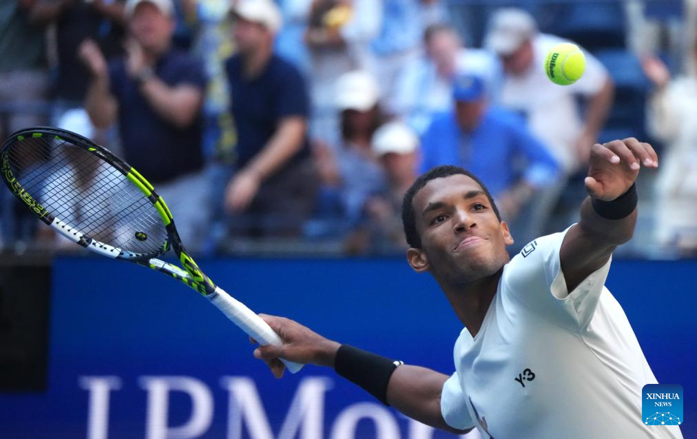 NUEVA YORK, 4 septiembre, 2025 (Xinhua) -- Imagen del 3 de septiembre de 2025 de Felix Auger-Aliassime, de Canadá, devolviendo la pelota durante el partido de cuartos de final de individuales masculinos ante Alex De Minaur, de Australia, en el campeonato de tenis US Open 2025, en Nueva York, Estados Unidos. (Xinhua/Li Rui)