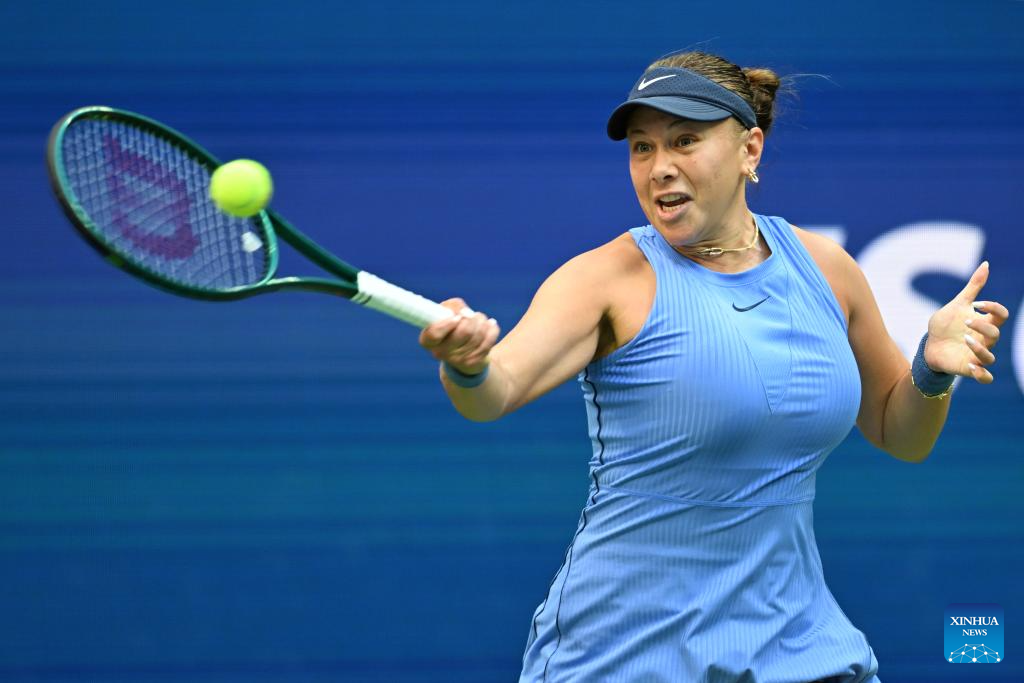 NUEVA YORK, 4 septiembre, 2025 (Xinhua) -- Imagen del 3 de septiembre de 2025 de Amanda Anisimova devolviendo la pelota durante el partido de cuartos de final de individuales femeninos entre Amanda Anisimova, de Estados Unidos, e Iga Swiatek, de Polonia, en el campeonato de tenis US Open 2025, en Nueva York, Estados Unidos. (Xinhua/Li Rui)