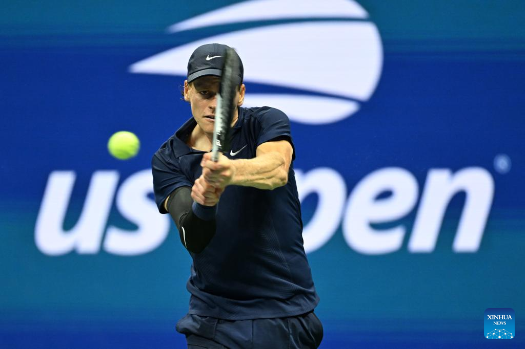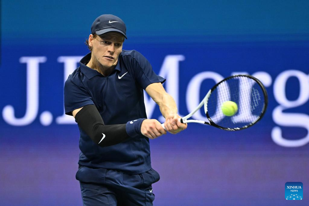 NUEVA YORK, 4 septiembre, 2025 (Xinhua) -- Imagen del 3 de septiembre de 2025 de Jannik Sinner devolviendo la pelota durante el partido de cuartos de final de individuales masculinos entre Jannik Sinner, de Italia, y Lorenzo Musetti, de Italia, en el campeonato de tenis US Open 2025, en Nueva York, Estados Unidos. (Xinhua/Li Rui)
