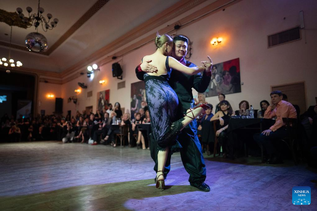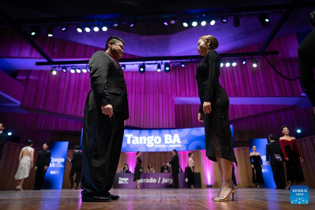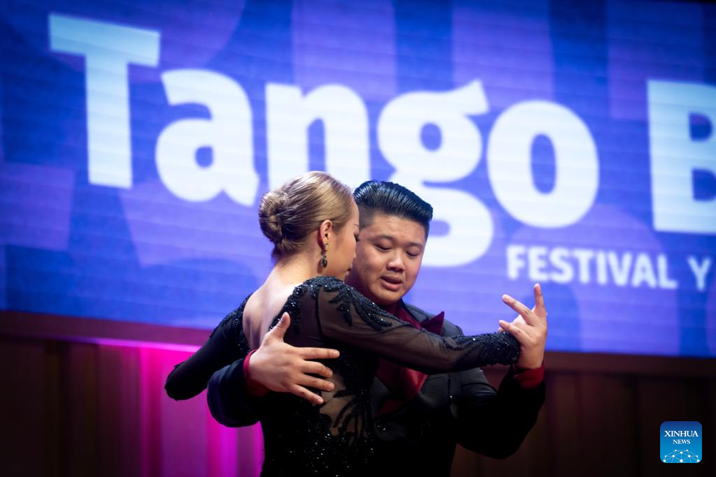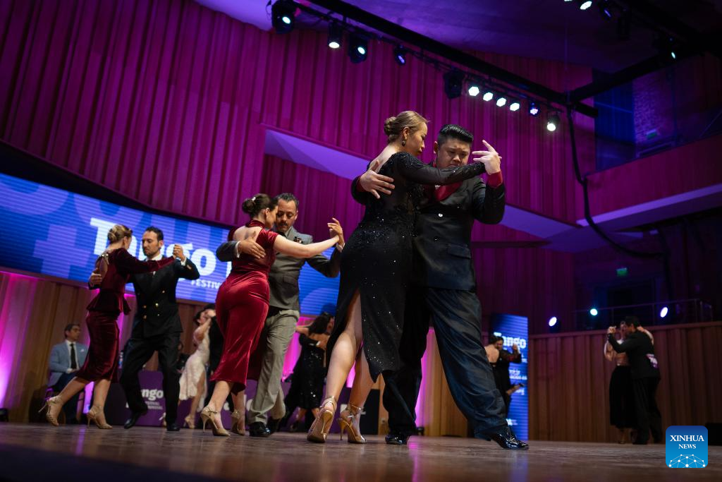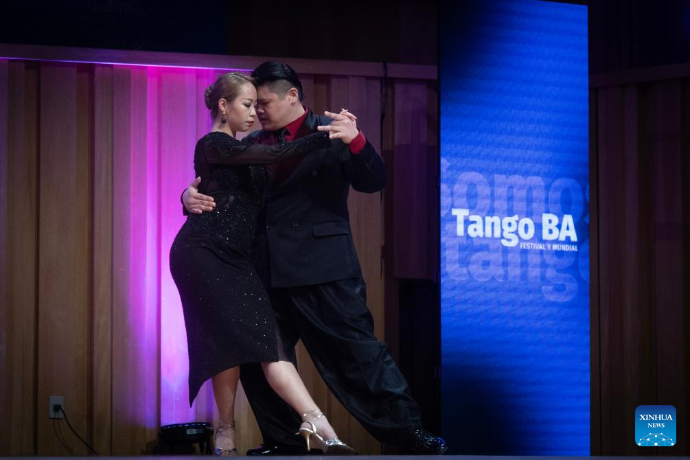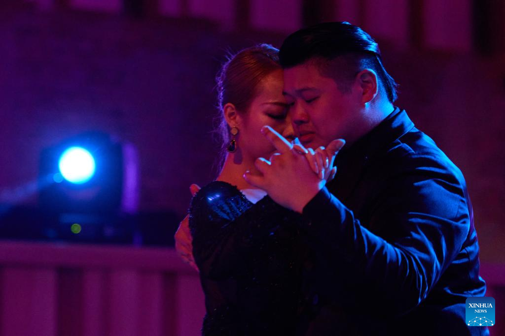 BUENOS AIRES, 5 septiembre, 2025 (Xinhua) -- Imagen del 27 de agosto de 2025 de Su Junqiang (d), y Guo Xingzhu, compitiendo durante los cuartos de final de la categoría Tango de Pista, en el Campeonato Mundial de Tango, en Buenos Aires, Argentina. En Buenos Aires, los bailarines de tango chinos Su Junqiang y Guo Xingzhu llevaron su pasión y dedicación al escenario mundial. La pareja, que ganó la competición regional de China en Shanghai a principios de este año, representó a China en el Campeonato Mundial de Tango 2025, avanzando a los cuartos de final y a las semifinales en la categoría "Tango de Pista" y realizando una presentación en la Milonga de Campeones. (Xinhua/Martín Zabala)
