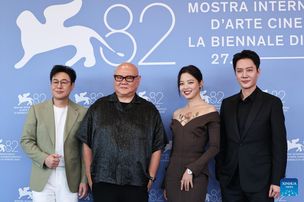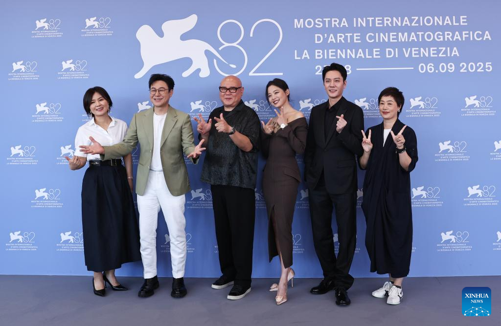 VENECIA, 5 septiembre, 2025 (Xinhua) -- El reparto principal y el equipo de la película "The Sun Rises On Us All" posan para una sesión fotográfica durante el 82º Festival de Cine de Venecia, en Venecia, Italia, el 5 de septiembre de 2025. (Xinhua/Li Jing)